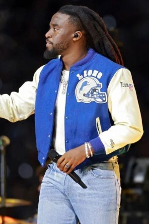 Shaboozey Detroit Lions Blue and White Bomber Jacket for Fans