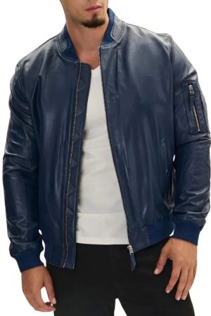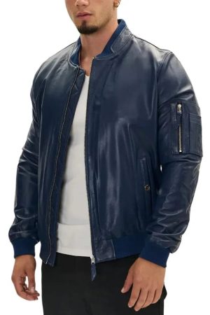 Men’s Blue Lambskin Leather Bomber Jacket