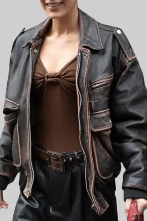 Bella Hadid Paris Distressed Brown Leather Jacket