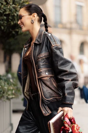 Bella Hadid Paris Distressed Brown Leather Jacket
