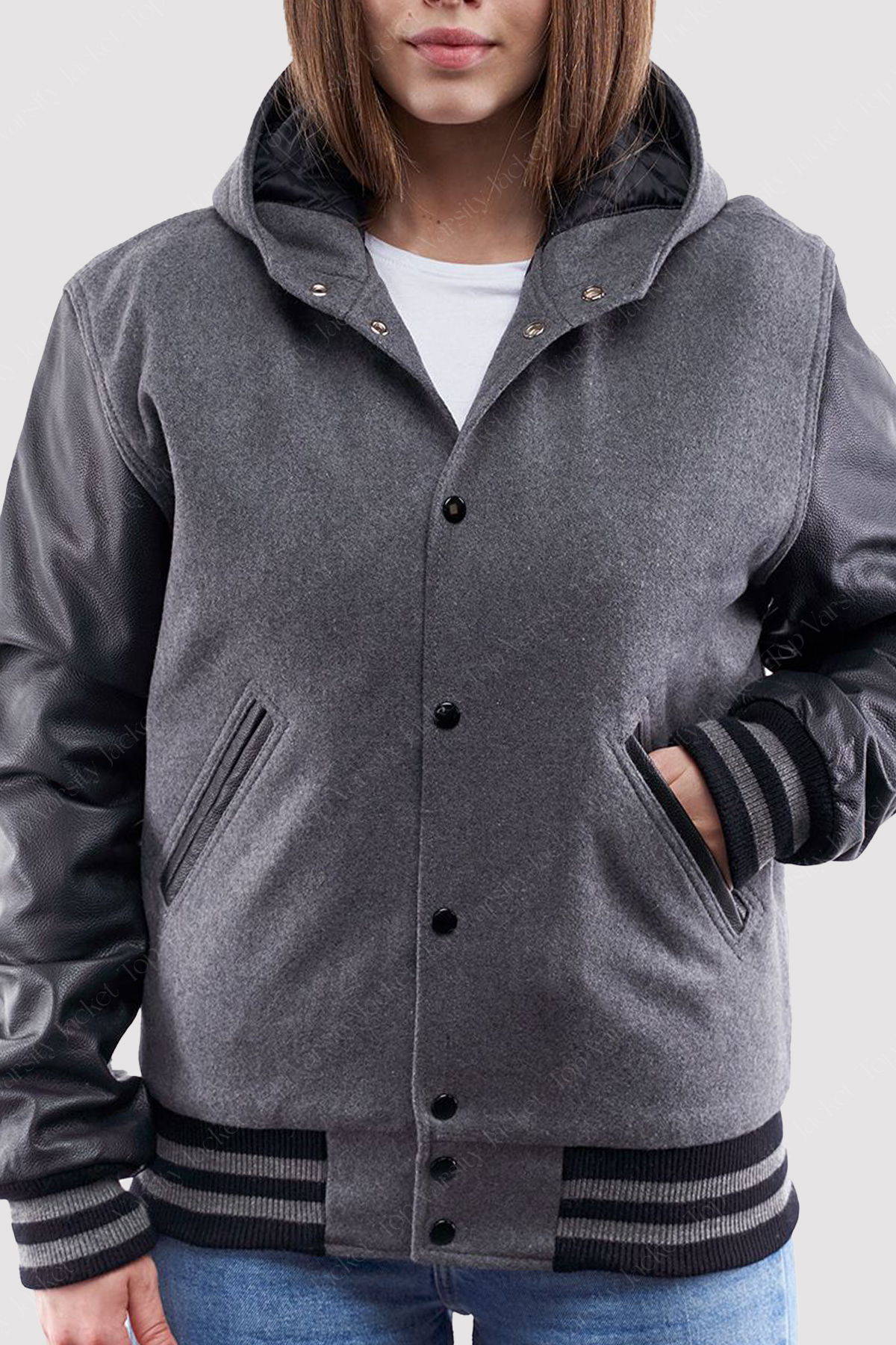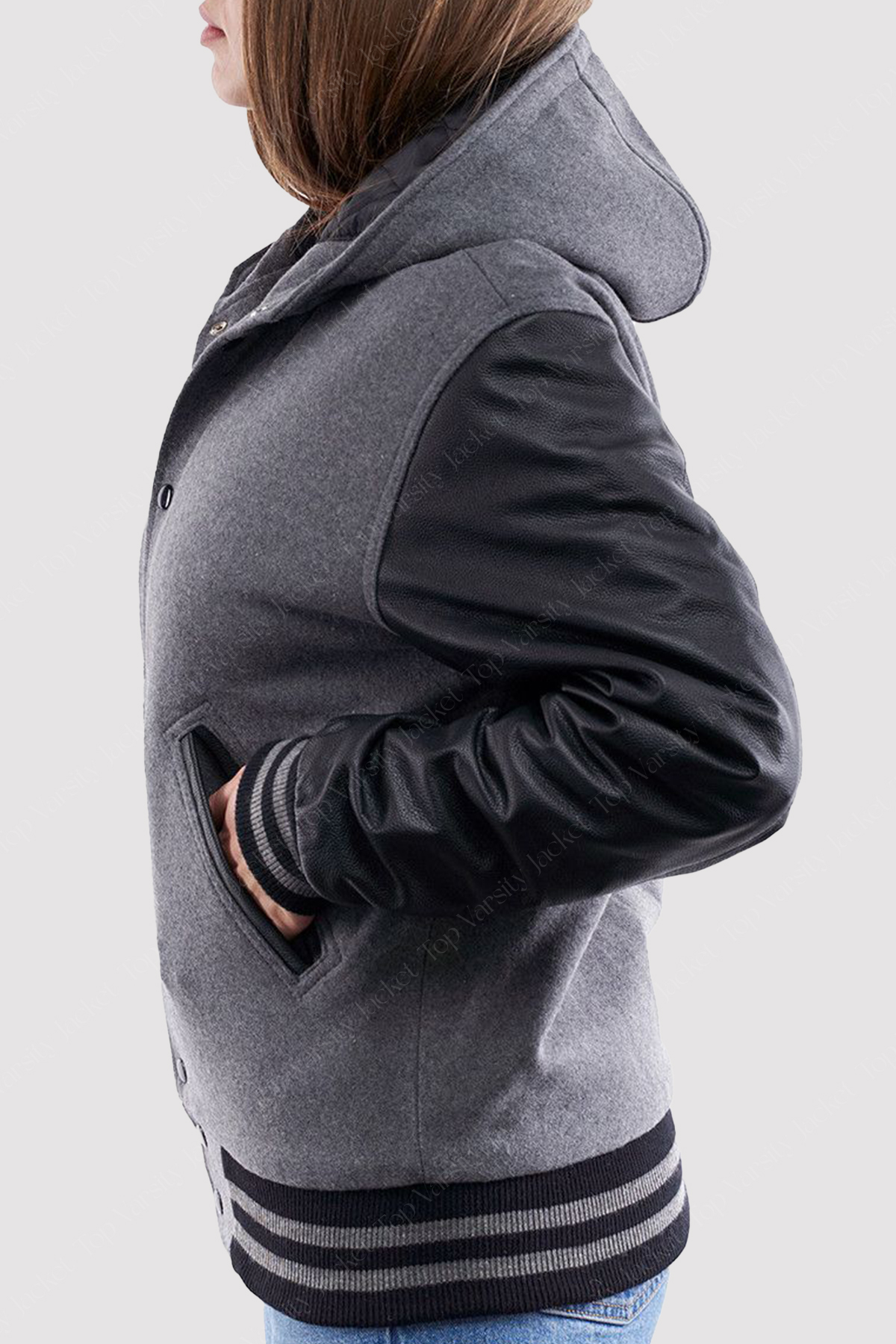 Light Oxford Gray Wool Body With Black Sleeves Hoodie Varsity Jacket For Women