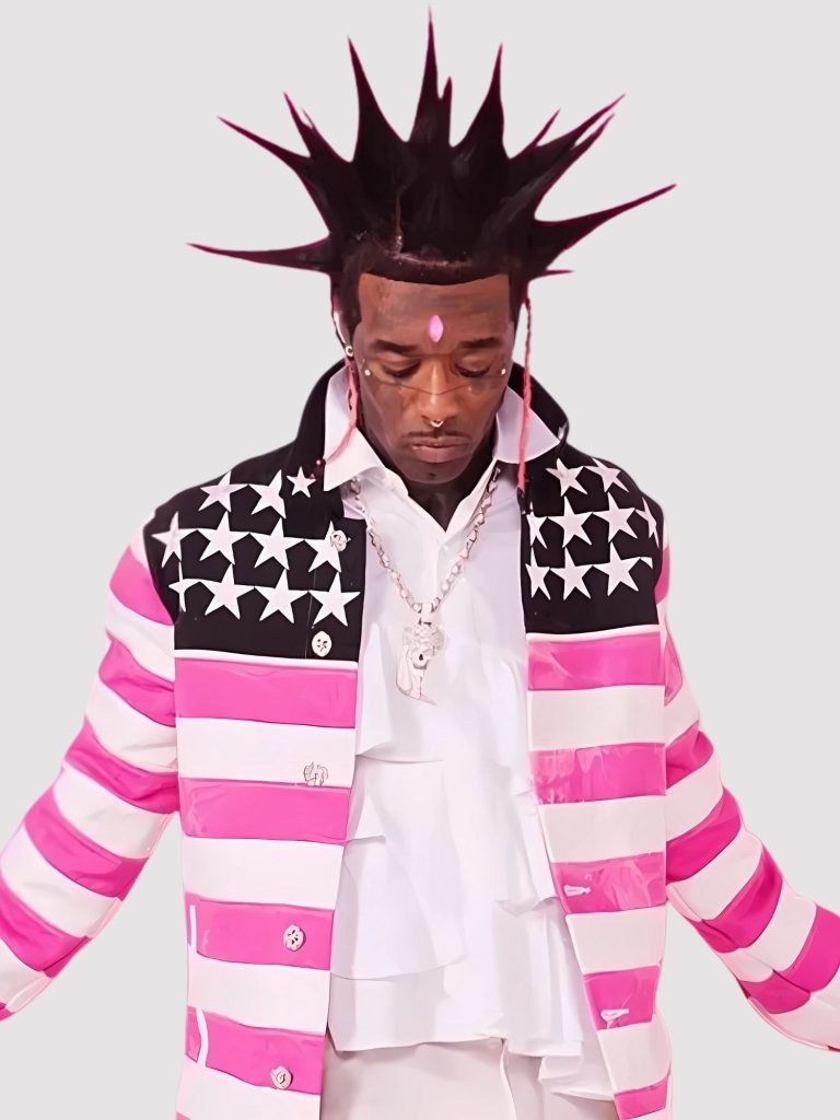 This jacket can be described as ground zero when punk meets patriotism. Lil Uzi Vert not only wears the Jacket, but it also blows up the fireworks into the opening part. The pink leather shouts louder than firecrackers during parades, and the multicolor paneling changes colors with the skies seen on sunsets. Wears it buckled with rebellion in grill Colour they call a neon bellow in a beige ocean. The Reasons why Conformity is afraid of this masterpiece