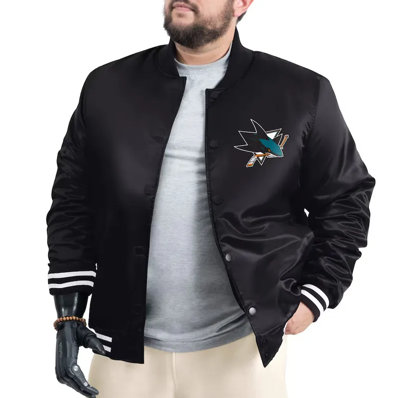 Experience Bold NHL Style with the San Jose Sharks Adaptive Satin Varsity Jacket