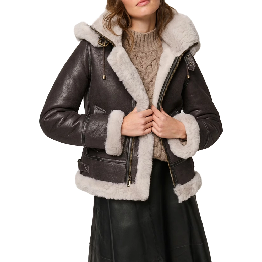 Women Dark Brown Leather Shearling Coat Aviator Jacket